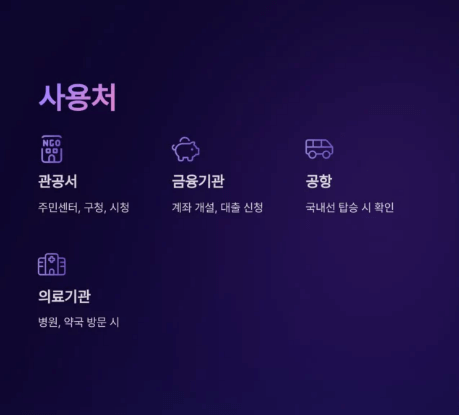 - 행정기관, 금융기관, 병원 등에서 실물 주민등록증과 동일한 효력 발휘